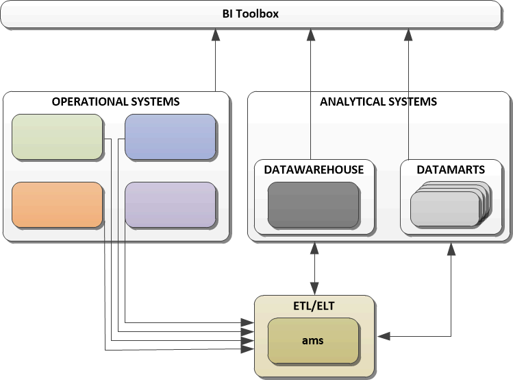 AMS provides framework, modular structure, modular workflow and governance (monitoring and controlling) for all Application Building Blocks or ETL components, which allows building long term basis for the last phase in the system, performing complex analysis which includes Data Mining, Reporting, etc.