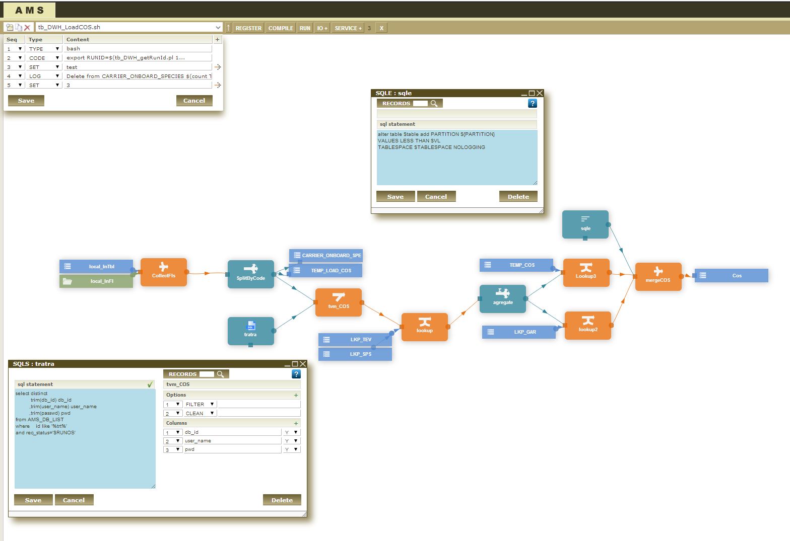 Ams seamlessly integrates the design and execution of applications which can be batch and/or near real-time allowing to execute tasks designed and built using ams-TD as well as any other tasks, executable, visable by the system, created in any other way.