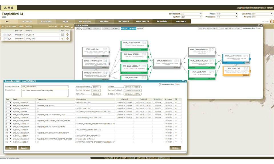 This monitoring screen shot on the right shows the dependencies between the different procedures within the selected phase (application) and the progress of each procedure.